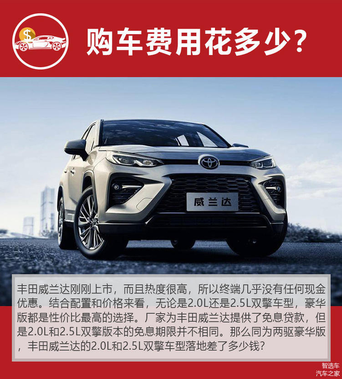 2月份上市的SUV车型中,广汽丰田威兰达的关注度非常之高。17.18万-24.18万元的指导价区间相比它的姊妹车型RAV4荣放要略低一些。从配置分布来看,2.0L燃油版和2.5L双擎版的两驱车型应该会是广汽丰田威兰达的销售主力。如果抛开动力体验不谈,对于同配置水平的威兰达2.0L燃油版和2.5L双擎版,大家最关心的应该是它们的购车、养车费用差异。今天的《钱车之鉴》栏目,小智就来帮大家计算一下威兰达燃油版和双擎版的购车、养车费用究竟差了多少。