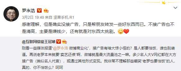 随后,老罗出来回应,说自己并没有接广告,只是给朋友帮忙宣传一下而已,这相当于侧面回应说没有加盟小米,也算是给舆论浇了瓢冷水。