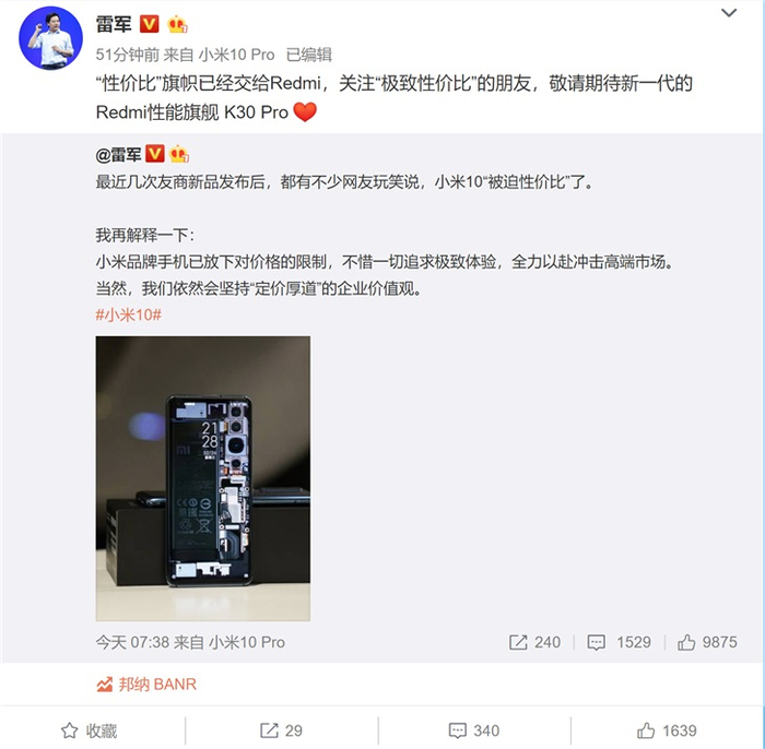 在小米10/Pro发布之前,小米公司及雷军就曾表示,小米品牌将冲击高端旗舰,今天雷军微博发文称,最近几次友商新品发布后,都有不少网友玩笑说,小米10“被迫性价比”了。