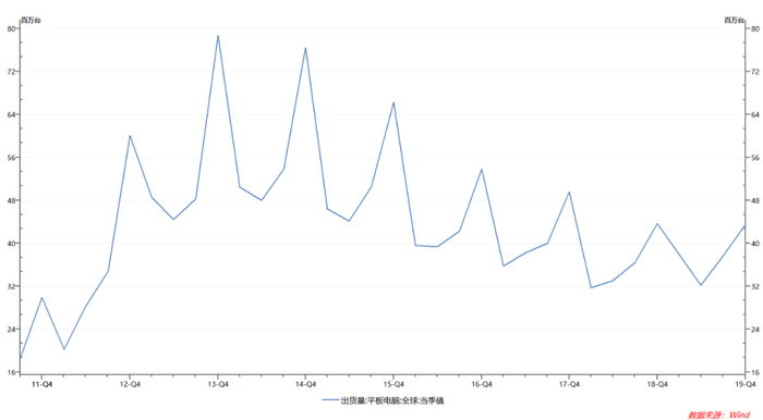 通过对近年来平板电脑的出货量观察,我们可以发现,2013年以后平板电脑的整体表现正处于波动下滑的趋势,即便每年第四季度都能迎来一个不小的增长,但总体市场的乏力依然明显。