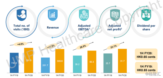 根据公司公告显示,2020财年上半年中,公司营业收入为3.07亿港元,同比增长17.2%,调整后EBITDA为5030.7万港元,同比增长28.5%,调整后净利润3170万港元,同比增长23.1%,每股分红0.65港仙。