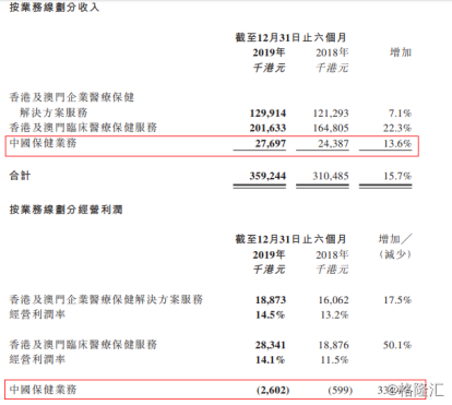 在2020财年上半年中,公司在中国内地的保健业务营收拥有显著提升,半年内录得营业收入2769.7万港元,同比增长13.6%。虽然在经营利润上有所亏损,但主要来自于GOLDTM金牌培训课程以及远程医疗业务的迅速发展,使得业务的人力资源投放有所增加。