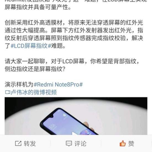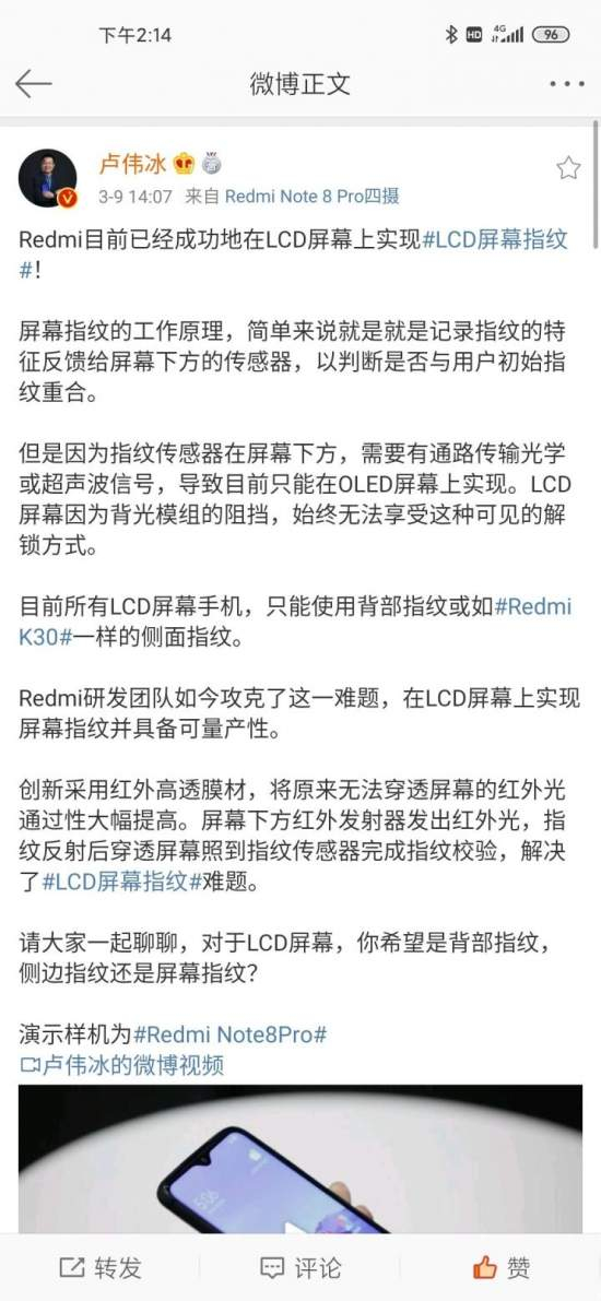 3月9日,Redmi红米总经理卢伟冰在微博上发布了一则重磅消息,即Redmi的研发团队已经在LCD屏幕上实现了屏下指纹解锁,并号称具备可量产性,同时还配有演示视频,这似乎表明了Redmi下一代中低端机型会铁定搭载这项技术,因为熟悉小米营销套路的朋友们都知道,一旦做什么新技术的微博预热,那么基本这项技术就会铁定搭载了。