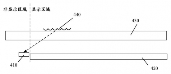 从图中可以看出,屏下指纹识别装置应用于具有背光模组420和液晶面板430的电子设备中,背光模组位于液晶面板的下方。液晶面板包括显示区域和非显示区域,液晶面板的显示区域上设置有指纹探测区域440。