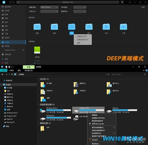 举个例子,资源管理器大家都熟悉,知道为什么很少有人在夜间开启黑暗模式吗?那是因为Win10只会将背景黑化,而图标与线条却没有做任何调整,导致所谓的“黑暗模式”甚至比正常模式还刺眼。贴一组与Deepin的对比图吧,孰优孰略大家自己来看!