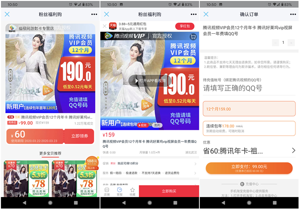 点击购买链接:天猫(99元),领取之后(前提是登录淘宝账号)会自动跳转到腾讯视频VIP会员年卡购买页面,下单后填写QQ号、结算即可。