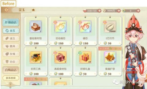 《食物语》原版的商城界面是偏功能型的列表式设计,虽然操作效率高,但内容的展示缺乏吸引力。界面色彩清新,偏冷淡,传递的感情比较冰冷,缺乏温度。