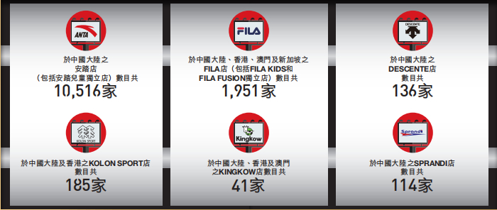 报告期内,安踏及相关品牌的线下门店数量12943家,其中,安踏店(包括安踏儿童独立店)为10516家,FILA店(包括FILA KIDS和FILA FUSION)为1951家。除童装品牌KINGKOW外,其他品牌门店均有一定数量增长。