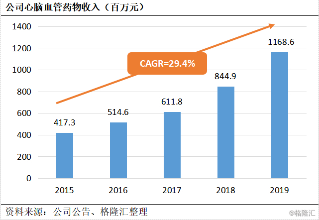 远大心脑血管急救产品覆盖了血小板抑制剂、血压控制、血管活性药等领域,抗血小板凝集注射剂及表面活性药均在中国市场中处于领导地位。19年,公司心脑血管药物收入约11.69亿元(+38.3%),其中核心产品利舒安、诺复康和瑞安吉共计收入约9.60亿同比增长48.7%。