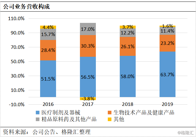 医药、器械是公司核心业务(收入贡献提升至64.0%),产品主要用于心脑血管急救治疗领域、呼吸、耳鼻喉及眼科治疗领域以及选择性内放射肿瘤治疗领域。受益产品结构改善和持续放量,业绩15-19年CAGR为34.1%,势头迅猛,19年营收达37.63亿元,同比增长24.3%,仍在快速成长,高于行业平均水平。