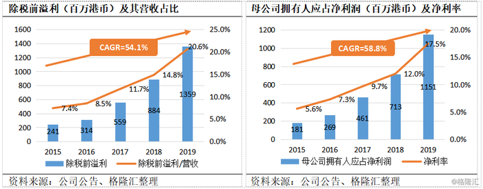 除税前溢利13.6亿港币,同比增长53.7%(15-19年CAGR=+54.1%),营收占比持续提升,19年较15年提升13.2%;