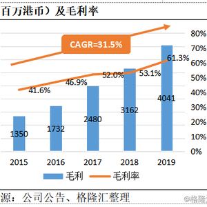毛利40.4亿港币,同比增长27.8%(15-19年毛利CAGR=+31.5%),19年毛利率同比大幅提升8.2%,19年较15年提升19.7%,根据港股wind西药制药成分股的近期毛利数据,毛利率挤进TOP10.0%,在A股化学制药(申万)指数成分股中挤进TOP30.0%;