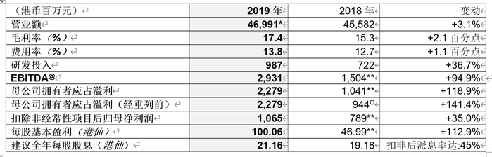 财报显示,2019年公司除税后净利润为23.3亿港元,同比增长125.5﹪;母公司拥有者应占溢利达22.8亿港元,较2018年重列前同比提升141.4﹪,经重列后2019年母公司拥有者应占溢利同比提升118.9﹪;扣除非经常性项目后归母净利润为10.7亿港元,同比增长35.0﹪。