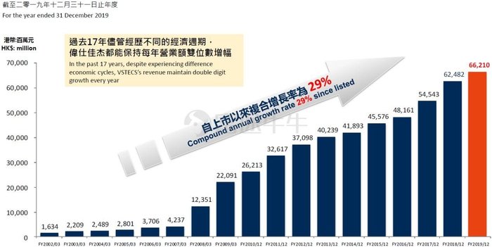伟仕控股有限公司于1991年成立,并于2002年在香港主板上市,后因2007年收购新加坡上市公司佳杰科技而成为伟仕佳杰。上市17年来,公司一直聚焦主业,聚焦ICT领域,逐步发展成亚太区领先的信息科技产品分销及服务企业,上市以来,营收持续增长,年化复合增长率为29%,足见其成长性。