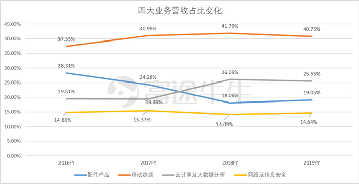 具体看2019年业务数据,四大业务分部中:移动终端业务分部营收269.8亿元,同比增长3.3%,营收占比40.07%;云计算和大数据业务分部营收169.1亿元,同比增长4.0%,营收占比25.5%;配件产品业务分部营收126.1亿元,同比增长11.77%,营收占比19.1%;网络及信息安全业务分部营收96.9亿元,同比增长10.14%,营收占比14.6%,所有业务分部都保持了持续的增长。