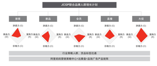 过去一年的消费者运营探索过程中,天猫实践并沉淀了诸多的经验方案和一些有价值的营销产品。而【联合品牌人群增长计划(JCGP)】则是阿里妈妈在2020年天猫在消费者运营上的进一步推动力,具体落地到“新客、新品、会员、直播、大促”这五大最具代表性的营销场景之中。来强化品牌人群在GROW模型各指标上的整体竞争力,即渗透力(G)、复购力(R)、价格力(O)、新品力(W)。