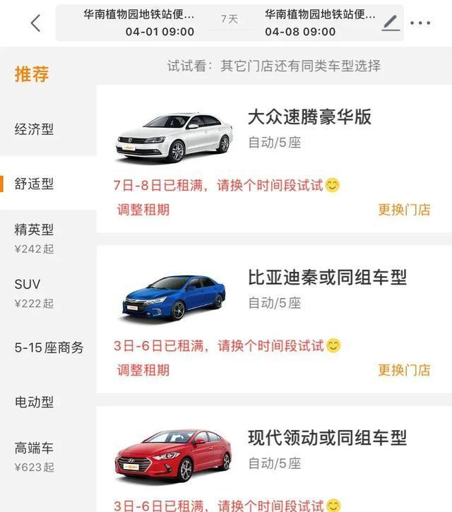 正当我打开一嗨租车APP查看四月份第一周经济舒适类的租车费用时,发现离我最近站点的该车型均已经被租光,而这家平台肉眼可见的优惠仅仅只有2日以上减免100元而已。