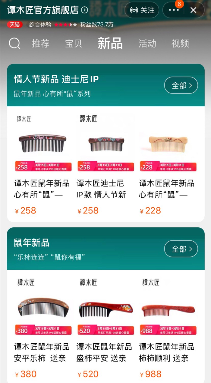 为了减少疫情带来的影响,谭木匠正在加大店员网络直播的培训。自去年4月开始,谭木匠每逢节日便开启直播。今年3月30日,还在天猫上开了一场关于“复工”的直播。