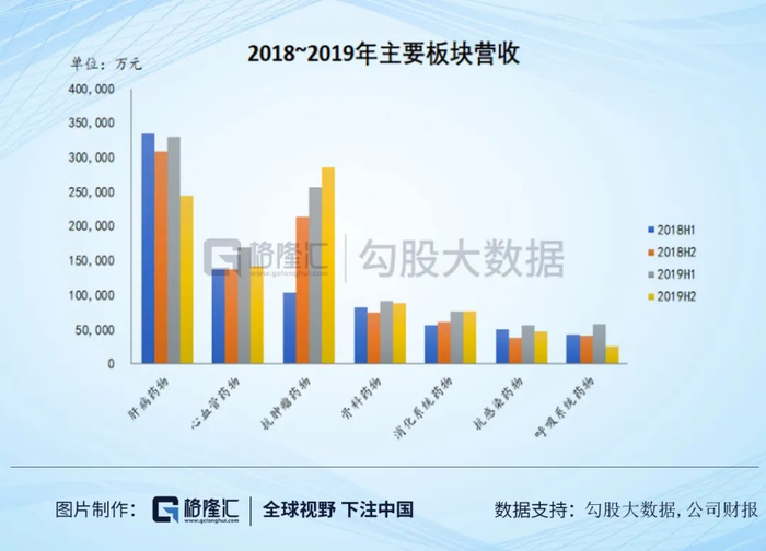 分品种看,肝病因为集采及竞品的降价压力,数据不太乐观,而作为公司主营的第一大板块,收到的下浮影响有多大也一直是市场关注的焦点。肝病用药之销售额约人民币57.4亿元,占公司总收入23.7%,目前依然是占比最大的板块,但是肿瘤板块增长迅速,预计今年肿瘤板块有望成为公司收入第一大板块。因为核心品种恩替卡韦的集采影响,整个板块全年下滑10.56%,4+7集采是2019年3月开始执行,Q2开始影响,所以2019年下半年数据下滑更为明显,同比下降了20.49%,带采扩面今年开始执行,这一块的影响可能还会扩大。