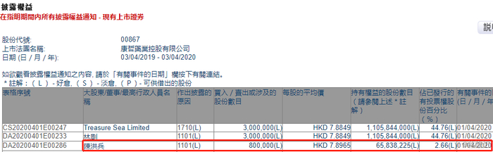 格隆汇APP获悉,根据联交所最新权益披露资料显示,2020年4月1日,康哲药业(00867.HK)获执行董事、副总裁兼首席运营官陈洪兵在场内以每股均价7.8965港元增持80万股,涉资631.72万港元。增持后,陈洪兵最新持股数目约为6583.82万股,持股比例由2.63%升至2.66%。