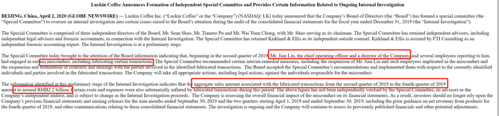 4月2日晚间,瑞幸官方发布公告,瑞幸咖啡三名独立董事组成特别委员会,负责监督时间截至2019年12月31日财年,合并财务报表审计期间的某些问题,并对此进行内部调查。