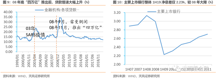 降息使得银行营收与盈利增速大幅下行。尽管09年贷款增速大幅上升,但息差大降仍使得主要上市银行1Q19利息净收入下降10.0%,营收增速则由08年的+23.9%转为1Q19的-4.76%,盈利增速由08年的+32.9%降至-8.5%。08年大幅度降息对银行业绩造成了非常显著的影响。