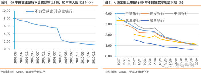 不过,08年金融危机对银行资产质量影响不显著。09年商业银行不良贷款率从年初的2.40%下降至年末的1.58%,大降82BP;主要上市银行09年不良贷款率均明显下降。