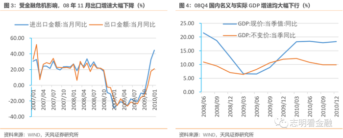 08年国际金融危机对出口造成了非常大的影响,08年11月出口增速由上月的19.3%大降至-2.2%,对国内经济的影响开始显现,08Q4名义GDP环比大降5.9个百分点,经济急转直下,出口明显负增长持续了一年时间。