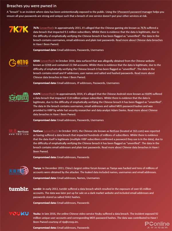 Have I been pwned会一一列出密码泄漏的来源,而且还详细说明是在什么时候、从什么网站、乃至通过什么手段被泄漏出去的,信息非常详尽。