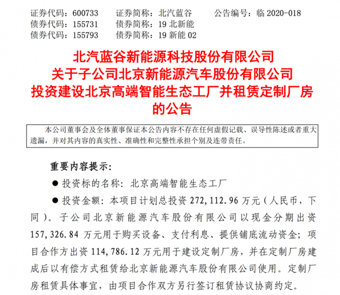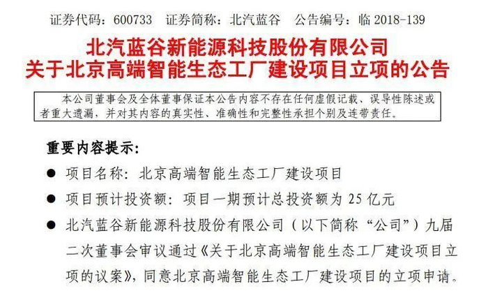 公开资料显示,北京高端智能生态工厂项目要追溯至一年半以前。2018年12月,北汽蓝谷(600733)召开董事会审议通过了《关于北京高端智能生态工厂建设项目立项的议案》,同意北京高端智能生态工厂建设项目的立项申请。