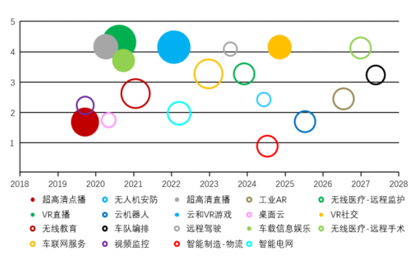 网络切片对各垂直行业应用提供高质量服务。IHS Markit根据应用场景需求量(气泡大小)、预期成熟时间(水平时间轴)和网络切片相关性(1-5级)对5G行业应用场景成熟度进行分类,其中实心气泡代表多媒体应用场景,这些行业最先采用,同时网络切片相关性更高。