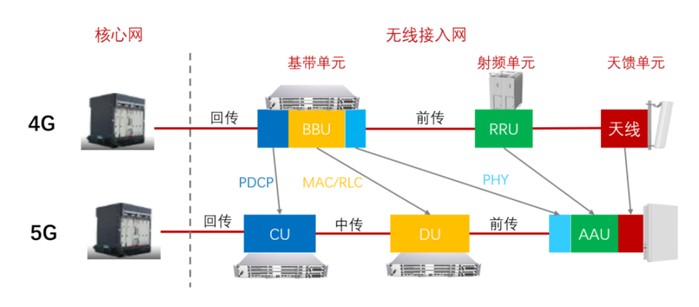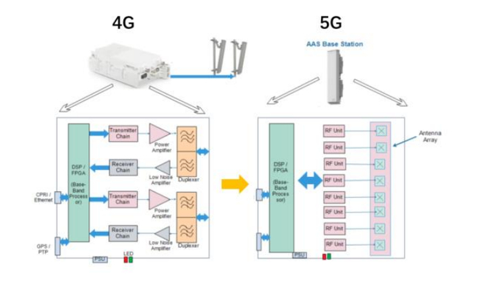 为了满足5G网络高功率、高频段和高速率的关键性能需要,5G基站设备和接入网相比4G发生了较大变化: