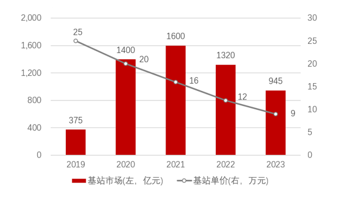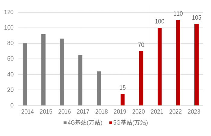2018年,全球基站设备市场规模达230亿美元。2019年,随着韩国、中国等国大规模5G部署陆续的展开,5G基站的增长抵消4G基站投资的下滑,从而推动全球整体基站设备市场持续增长。根据Dell'Oro Group最新发布的预测报告显示,全球基站设备市场在2019-2024年的总规模将达到2000亿美元。预计我国三大运营商在2019-2023年5G基站设备投资超过5600亿元。我们以基站3G/4G建设数量为基础,预计在2019-2023年,中国三大运营商预计共建设5G基站400万站,逐年建设量约15/70/100/110/105万站,每年基站设备投资规模约375/1400/1600/1320/945亿元。