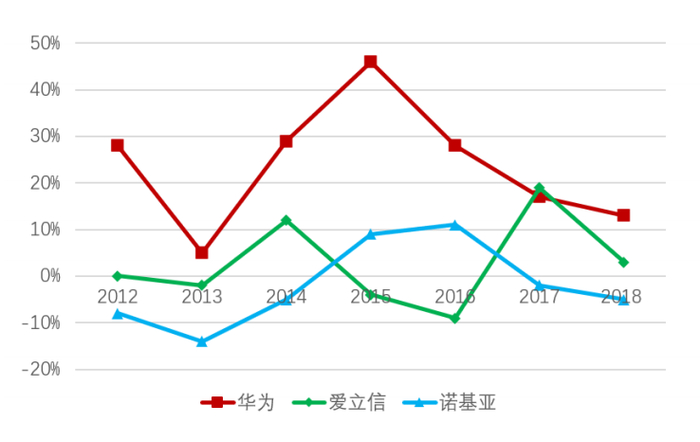 行业龙头企业的竞争优势依赖于研发的长期投入与技术积累。尽管移动通信设备商面临巨大的成本压力,为了保持较强的市场竞争力,依然投入了巨额的研发费用。2018年,华为、爱立信、诺基亚、中兴的研发支出分别达到129/46/38/13亿欧元,其中华为、爱立信、诺基亚的研发支出进入全球排名前50位。根据Strategy Analytics的统计,2011年至2013年华为、爱立信、诺基亚的研发支出接近,但2014年以来,华为在研发方面支出增速远高于爱立信和诺基亚,华为在5G时代到来时获得了绝对的行业领先优势。经历了2018年禁运事件后,中兴通讯也进一步加大研发投入,2019上半年研发费用64.72亿元,占营收的14.5%,相比2018年明显提升。研发费用的长期大幅投入和新技术的持续积累,保证了在高门槛通信行业的长期竞争力。