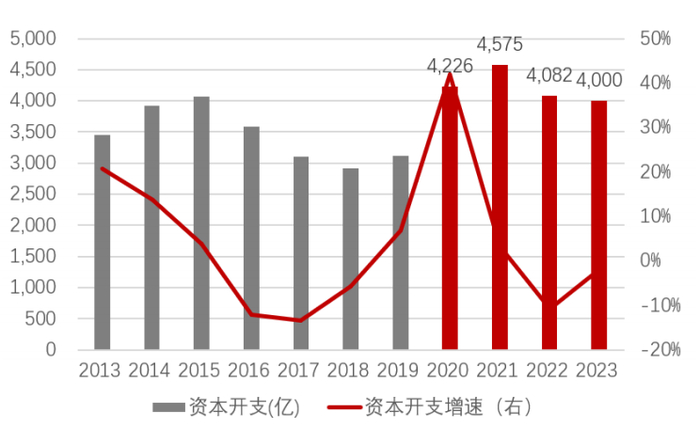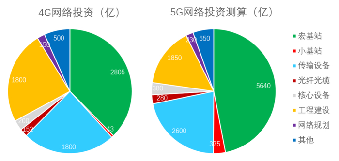 回顾4G网络建设历程,2014-2017年,三大运营商4G基站年建设量分别达到80万站、92万站、86万站和65万站,资本开支分别达到3926亿元、4075亿元、3582亿元和3100亿元,其中4G总投资达到7450亿。从投资结构上看,无线接入网(宏基站、小基站)和传输网(传输设备、光纤光缆)各占三分之一,核心网、网络规划、工程建设和其他配套投资占三分之一。