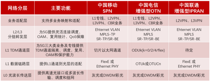 我国运营商5G传输网采用的方案包括切片分组网络(SPN)、面向移动承载优化的OTN(M-OTN)和增强型IPRAN。SPN是中国移动在3G/4G的传输网PTN技术基础上,面向5G和政企专线的业务承载需求,融合创新提出的新一代切片分组网络技术方案。M-OTN是中国电信综合考虑5G承载和云专线等业务需求,创新提出的面向移动承载优化的OTN技术方案。增强型IPRAN是中国联通基于IPRAN的5G组网架构,包括城域核心、汇聚和接入的分层结构。