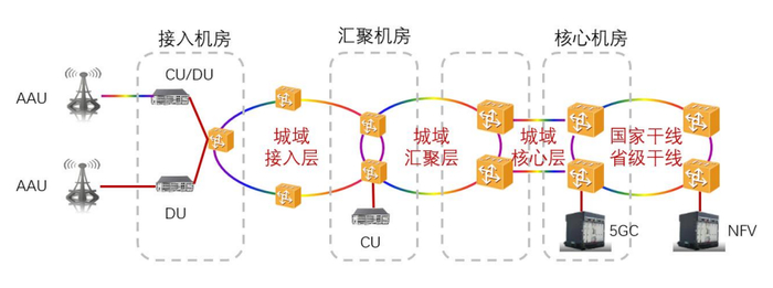 传输网由城域网和骨干网组成,城域网可分为接入层、汇聚层和核心层,骨干网可分为省级干线和国家干线。城域接入层负责基站的接入,基站CU和DU的组网互联;城域汇聚层负责不同区域接入层的数据流量汇聚;城域核心层负责不同区域汇聚层的数据流量汇总,并与核心网进行对接。省级干线负责省内各城市城域网的互联,国家干线负责各省级干线的互联。