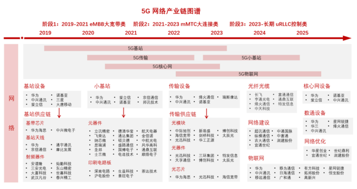 5G网络设备是5G网络投资的最主要部分。5G网络设备包括基站、传输网、核心网和支撑计费等配套系统。其中,基站包括宏基站、小基站和室内分布系统,基站上游供应链包括天线、芯片、射频器件、印刷电路板等各类元器件。传输网包括光纤光缆和传输设备系统,传输设备系统上游供应链包括光芯片和光模块等光器件。核心网包括各类网元和网络虚拟化等类型设备。网络建设包括网络规划、工程设计和工程建设。网络优化包括基站覆盖优化和核心网优化等内容。