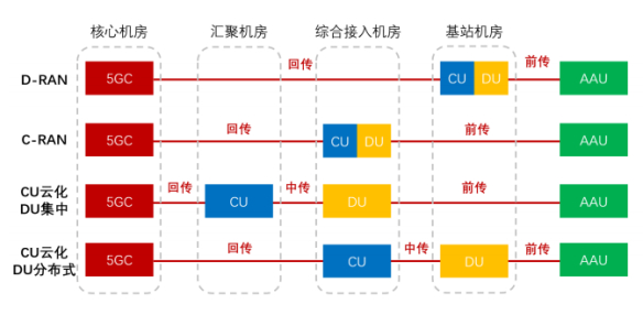 考虑5G基站CU/DU部署位置时,选择基站机房、综合接入机房和汇聚机房不同的组网方案具备不同的组网优势。随着5G无线接入网架构的变化,5G无线接入网划分为前传、中传、回传三部分,根据CU/DU合设或分离,可以形成多种组网方案,带来光纤和光模块的新需求。