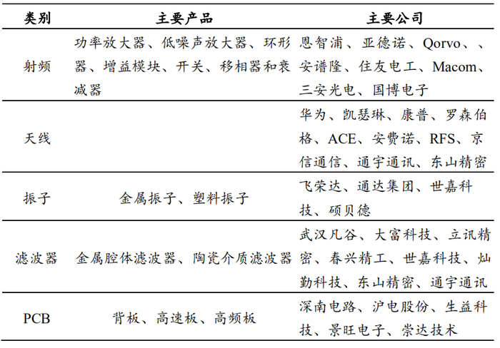 5G基站的巨大变化使得基站供应链充分受益。5G AAU包括中频模块、转换模块、射频模块和阵列天线。射频模块和阵列天线变化最大,射频模块包括射频前端器件和5G特有的波束赋形器件,阵列天线将振子、PCB、滤波器集成一体化。对于5G基站供应链部分,请见后续5G基站供应链深度报告。