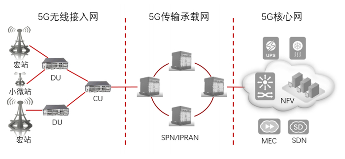 5G传输网是为了5G基站和5G核心网提供网络连接的基础网络,不仅为网络连接提供灵活调度、组网保护和管理控制等功能,还要提供带宽、时延、同步和可靠性等方面的性能保障。传输网不仅可连接基站和核心网,也可连接基站的CU/DU和核心网内部的设备,整个通信网络的数据传输都是由传输网负责。