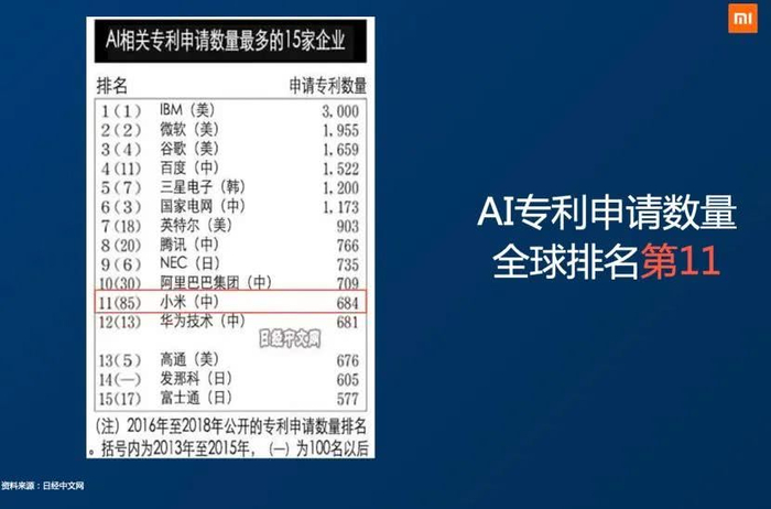 2018年小米在AI领域申请专利已达684项,全球排在第11位,在中国互联网公司中排名第4。2019年,小米面向智能家居的人工智能开放创新平台被科技部授予“国家新一代人工智能开放创新平台”。
