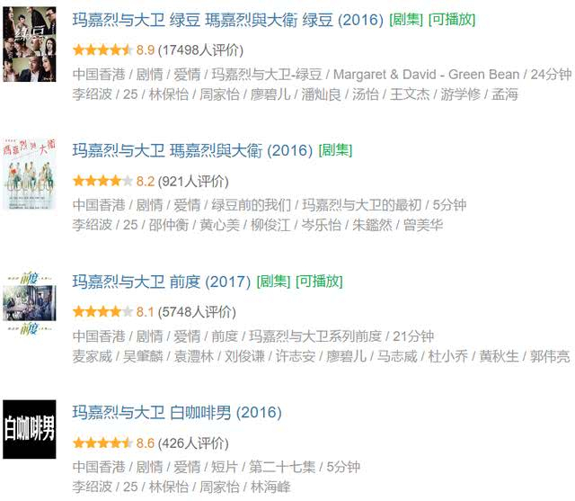 2016年的开台剧《玛嘉烈与大卫-绿豆》,由林保怡、周家怡、潘灿良及廖碧儿主演,改编自南方舞厅的同名小说,并随之制作了很多衍生剧,例如《玛嘉烈与大卫-绿豆前的我们》《绿豆中的diamond》《绿豆中的赵子龙》《绿豆中的玛嘉烈》《绿豆中的大卫》,在豆瓣收获了不俗的口碑。同时,这部剧的导演Fatball与25,亦是《叹息桥》的导演。