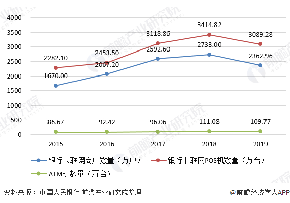 截至2019年末,银行卡跨行支付系统联网商户为2362.96万户,联网POS机具3089.28万台,ATM机具109.77万台,分别同比减少370.04万户、325.54万台和1.31万台。