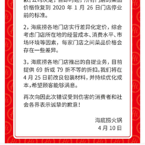 4月10月,海底捞发布《致歉信》,称此次涨价是公司管理层的错误决策,伤害了海底捞顾客的利益,对此深感抱歉。公司决定,自即日起,所有门店的菜品价格恢复到2020年1月26日门店停业前的标准。海底捞各地门店推出的自提业务,目前提供69折或79折不等的折扣。