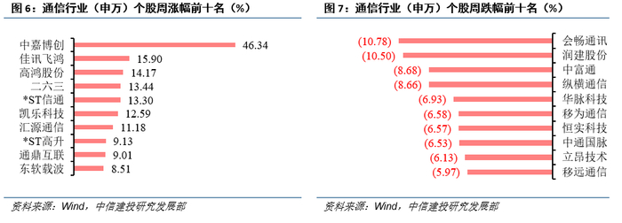 个股方面,涨幅前五个股分别为:中嘉博创(46.34%)、佳讯飞鸿(15.90%)、高鸿股份(14.17%)、二六三(13.44%)、*ST信通(13.30%);跌幅前五个股分别为:会畅通讯(-10.78%)、润建股份(-10.50%)、中富通(-8.68%)、纵横通信(-8.66%)、华脉科技(-6.93%)。