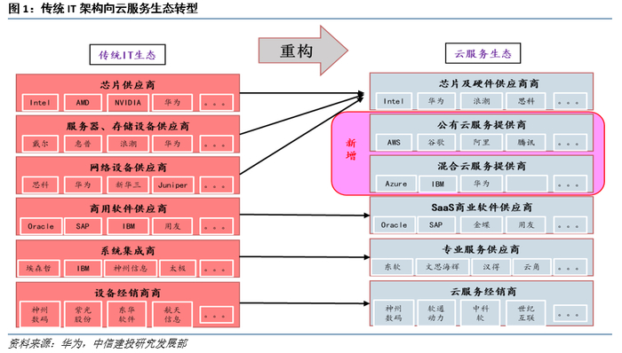 从技术角度来看,传统烟囱式IT架构,在易扩展性、稳定性、经济性上存在劣势。云计算发展的头十年,以互联网、电商等行业客户为主要需求的公有云发展较快,AWS、阿里云等受益最大。最近几年,随着传统大中型企业开始逐步接受云计算架构,越来越多的企业开始以混合云的方式部署IT系统,在此过程中,以2B基因擅长的微软、华为等公司受益。