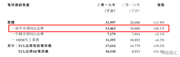 2019年公司全球销量增长的主要驱动力仍然来自海外市场。海外市场方面,2019年 TCL品牌电视机销售量同比上升26.1%达1,346万台,海外市场品牌电视机销量占整体品牌电视机销量65%以上;TCL品牌电视机营业额达210亿港元,同比增长14.1%;TCL 品牌电视机经营业绩同比提升42.3%至8.8亿港元。其中,2019年TCL品牌电视在美国取得14%的同比增长,销量位列第二,进一步拉近与第一名间的差距。TCL电子进一步稳固其在北美市场中的地位。