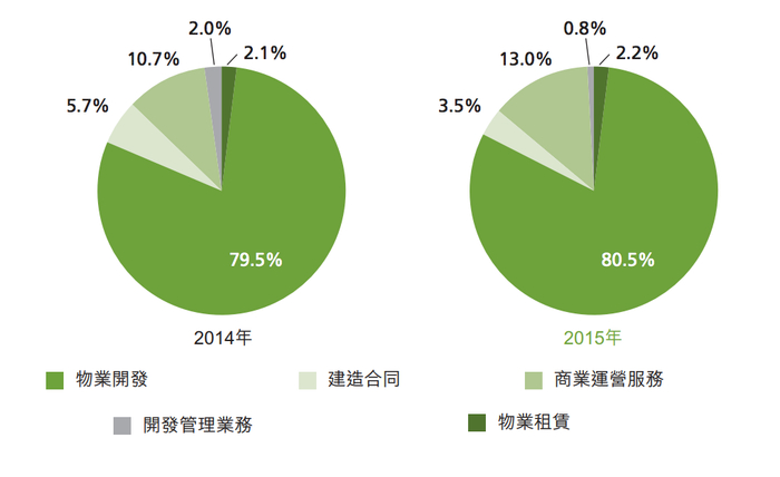从2014、2015年报的营收结构来看,物业开发业务收入占比最高,2014年占比79.5%,2018年占比80.5%;商业运营服务、物业租赁业务收入占比低于15%。