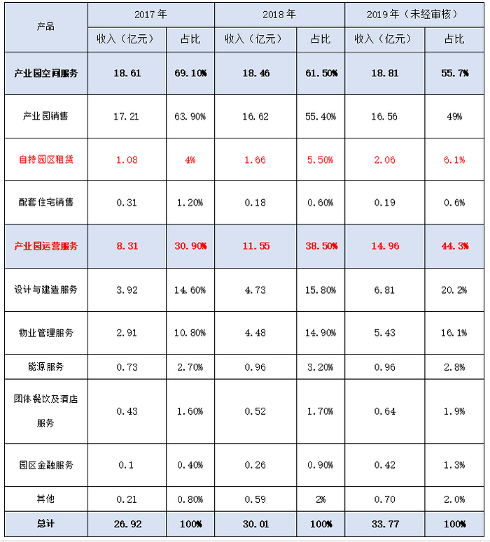 2015年,中电光谷实现总营业收入19.04亿元,其中运营服务与物业租赁收入占总营业收入比例仅有15.2%。2018年总营业收入30.01亿元,产业园运营服务及产业园租赁等收入占比达到44%;2019年总营业收入33.77亿元,产业园运营服务及产业园租赁等收入占总营业收入提升至50.4%,转型变革成效显著。